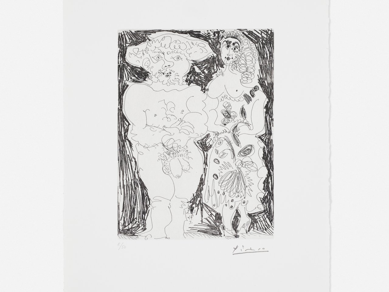 13 h × 10 w in (33 × 25 cm); Signed and numbered to lower edge '8/50 Picasso'. This work is one of three three plates from Series 156 hand-signed by the artist and is number 8 from the edition of 50 with 15 artist's proofs published by Galarie L. Leiris, Paris.