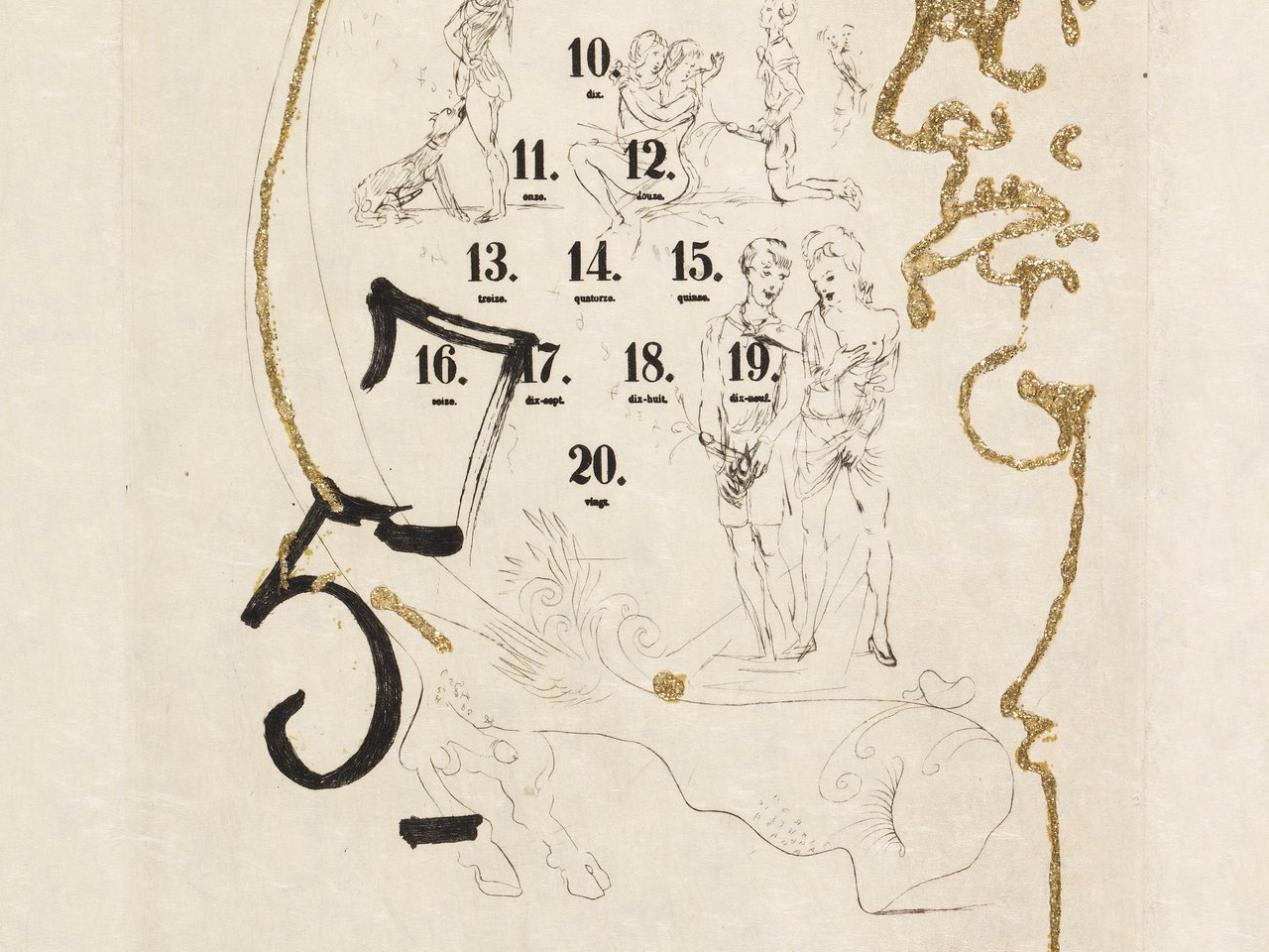 Les Amours Jaunes . 1974. Portfolio with 10 Drypoints with gold coating. Field 74-15. Each signed and numbered. Additionally numbered in imprint. From an edition of 200 copies on Japon. Imprint on Arches (with the watermark). Each: 29.5 x 21.2 cm (11.6 x 8.3 in). Sheet: each 38,7 x 28 cm (15,2 x 11 in). The ten etchings by Dalí illustrate poems from Tristan Corbière's (1845-1875) poetry book "Les amours jaunes" from 1873. In original cloth case with the artist's gilt-tooled name. Printed by Ateliers Bellini, gilt coating applied by Daniel Jacomet, Paris. Published by Èditions Pierre Belfond, Paris 1974 (with signed certificate of authenticity). This is the second German edition, published simultaneously with the first edition by Timm Gierig. [CH]. Complete portfolio. The gilt coating makes each work a unique object. Dalí's interpretation of the poetry book "Les amours jaunes“. After a literary model . Bruce Hochman OS has kindly confirmed the authenticity of this lot.