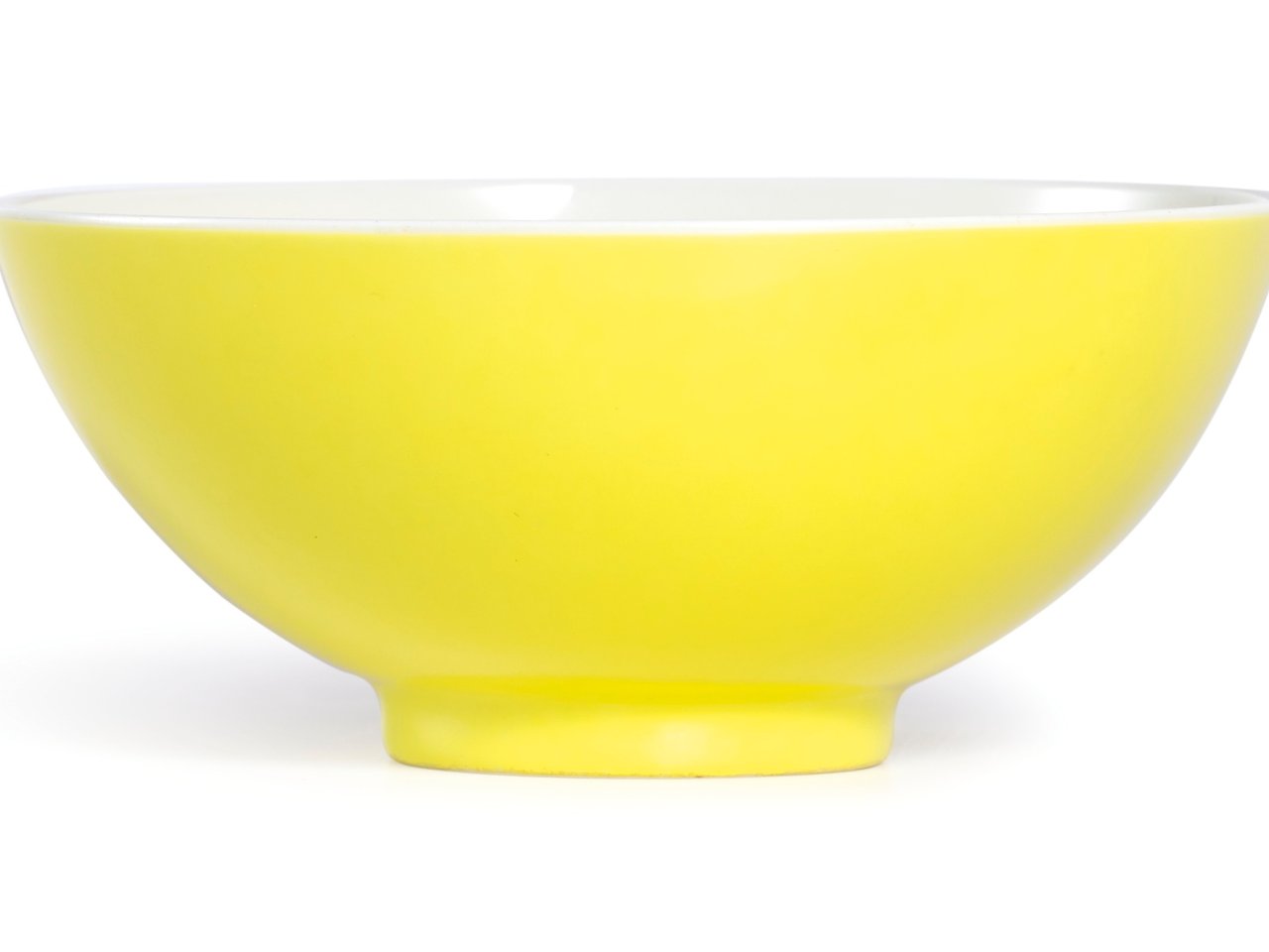 delicately potted with deep rounded sides resting on a short straight foot, the exterior applied with a vibrant lemon-yellow glaze stopping neatly at the foot, the base inscribed with a six-character reign mark within a double-circle