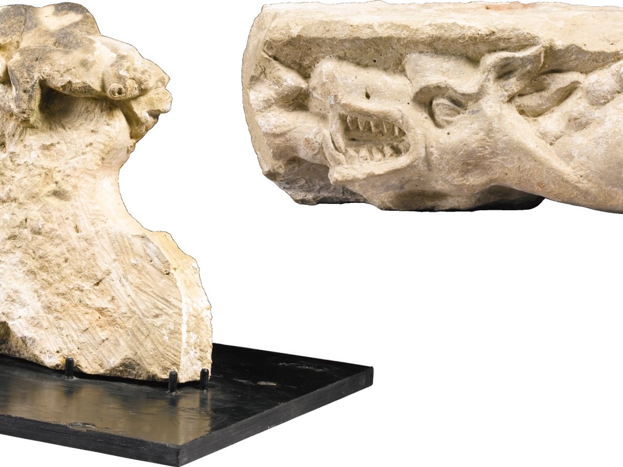 FRAGMENT OF AN ARCHITRAVE WITH A DRAGON AND PART OF AN ARCH SURMOUNTED BY TWO BATTLING BEASTS
