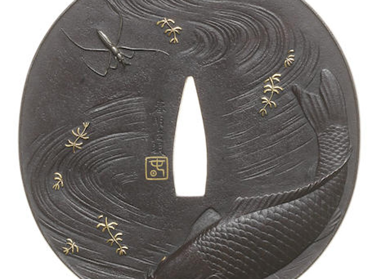 Almost circular with slightly raised rim, carved in relief and inlaid in gold, on one side a carp swimming among waterweed in a fast-flowing river with a water boatman above, on the other side three turtles in the river; signed Haruaki Hogen with gold-inlaid square seal Haru, (2)