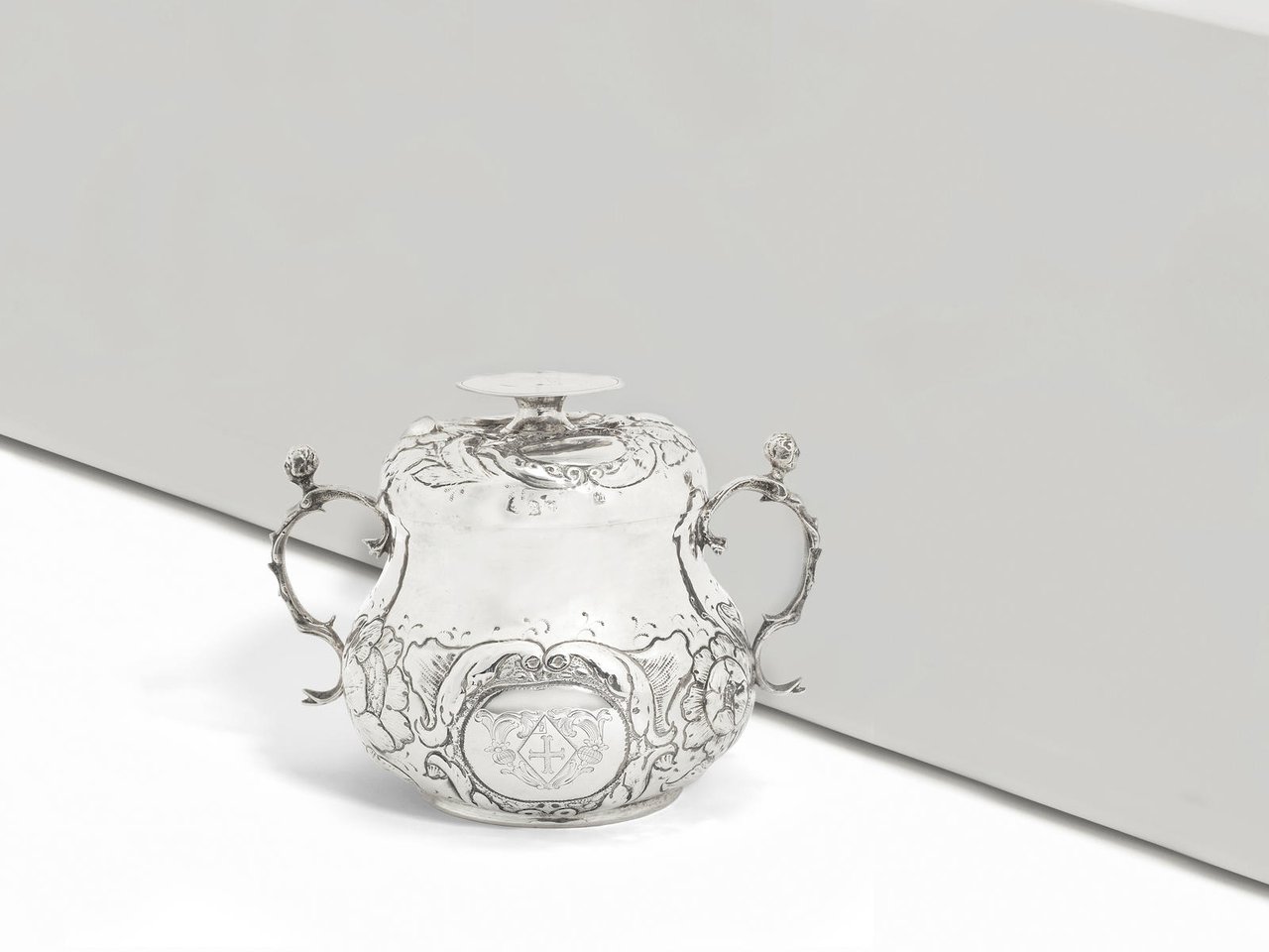 The bellied body chased with large flowers and leaves, acanthus borders to the two reserves, one with armorial engraving, caryatid handles, the cover similarly chased between two vacant reserves, with a short pedestal top, weight 20.9oz.