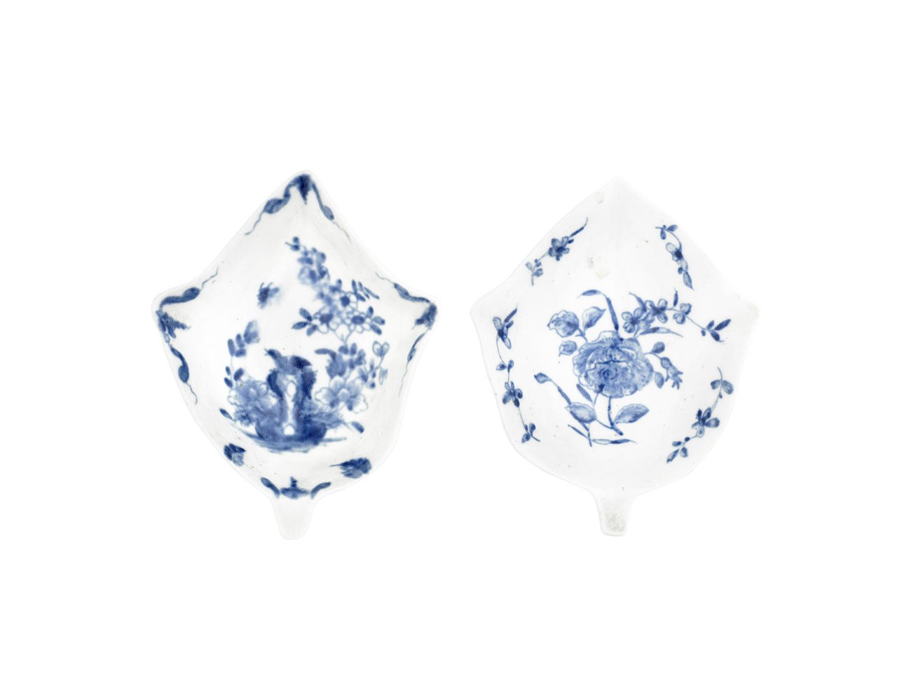 Of vine leaf shape with short stem handles, one painted in blue with the 'Rose and Floral Sprays' pattern, , workman's mark, the other with the 'Two Peony Rock Bird' pattern, workman's mark (2)
