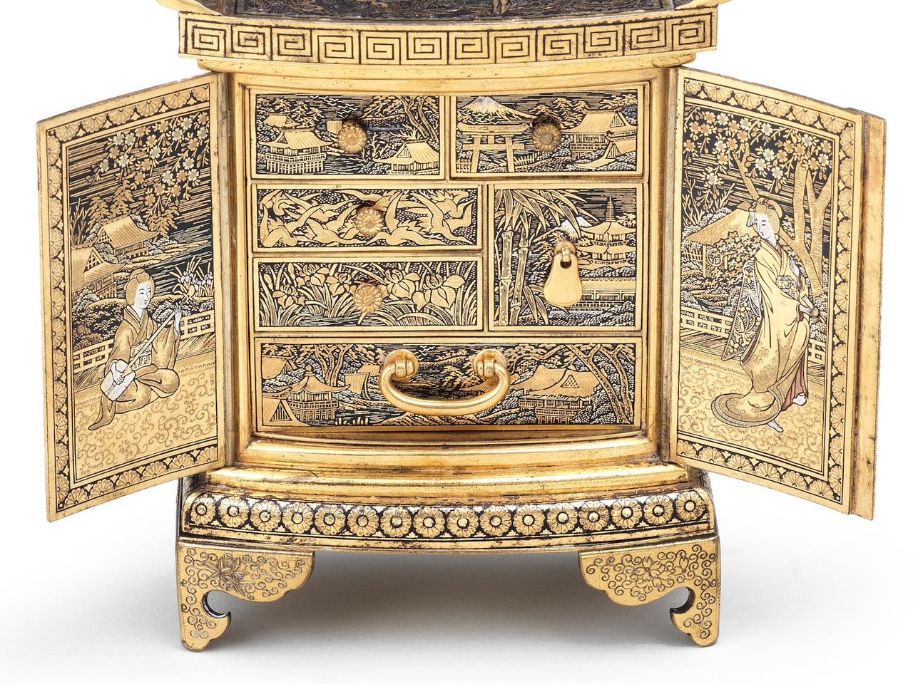 Worked throughout in mainly gold overlay and raised on four tall bracket feet, the pair of hinged doors applied with a gold clasp in the form of a spray of cherry blossoms decorated on the outside with three cranes in flight over thatched dwellings nestled among pine trees, a torii and a stone lantern in the foreground and a pagoda in the distance, opening to reveal within six removable drawers of different size decorated with various outdoor rural and bird-and-flower scenes including a flock of cranes, irises and Mount Fuji looming in the distance, the inside of the doors embellished with an elegantly clad woman standing beneath cherry branches on one door and a seated musician on the other, the sides of the cabinet similarly decorated with a pagoda, the scrolled top with a confronted phoenix and dragon, the reverse with a cockatoo perched on a rock around which issue flowering peonies reserved on a ground of dense fruiting vine, engraved on the base with butterflies hovering among floral wreaths, inscribed on the base Fuku within a fan-shaped panel.