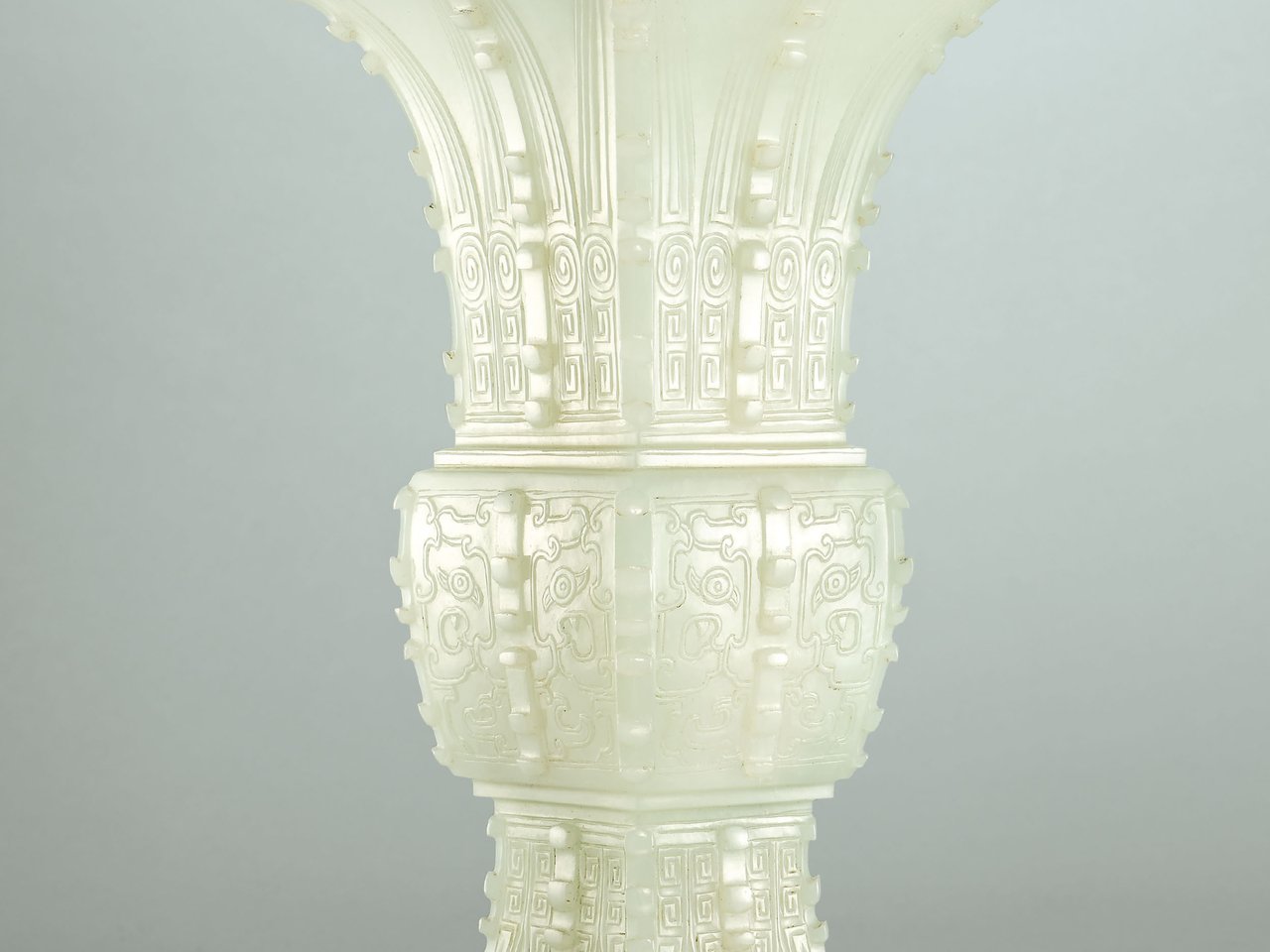The vase is of square section and modelled after an archaic bronze wine vessel fanggu. The mid-section is carved in low relief with a taotie mask on each facet, between lappets filled with archaistic scrolls spreading outward on the trumpet neck and splayed foot. The corners and vertical mid-section of each facet are carved with notched flanges in high relief. The stone is of an even semi-translucent white tone.