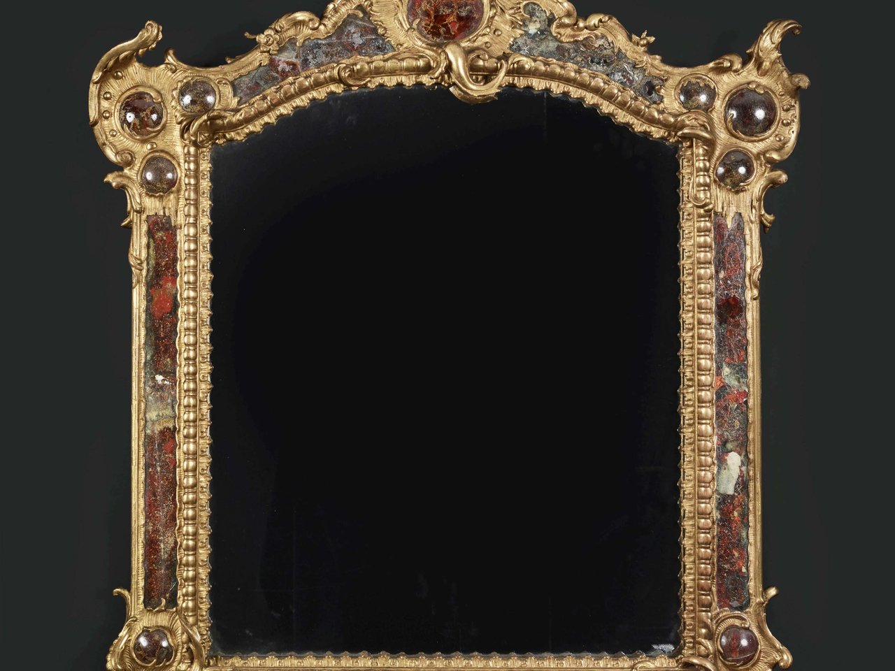 En bois sculpté et doré, incrustations de verre églomisé à l'imitation de l'écaille ou la pierre dure, à motif de cabochons et agrafes rocaille