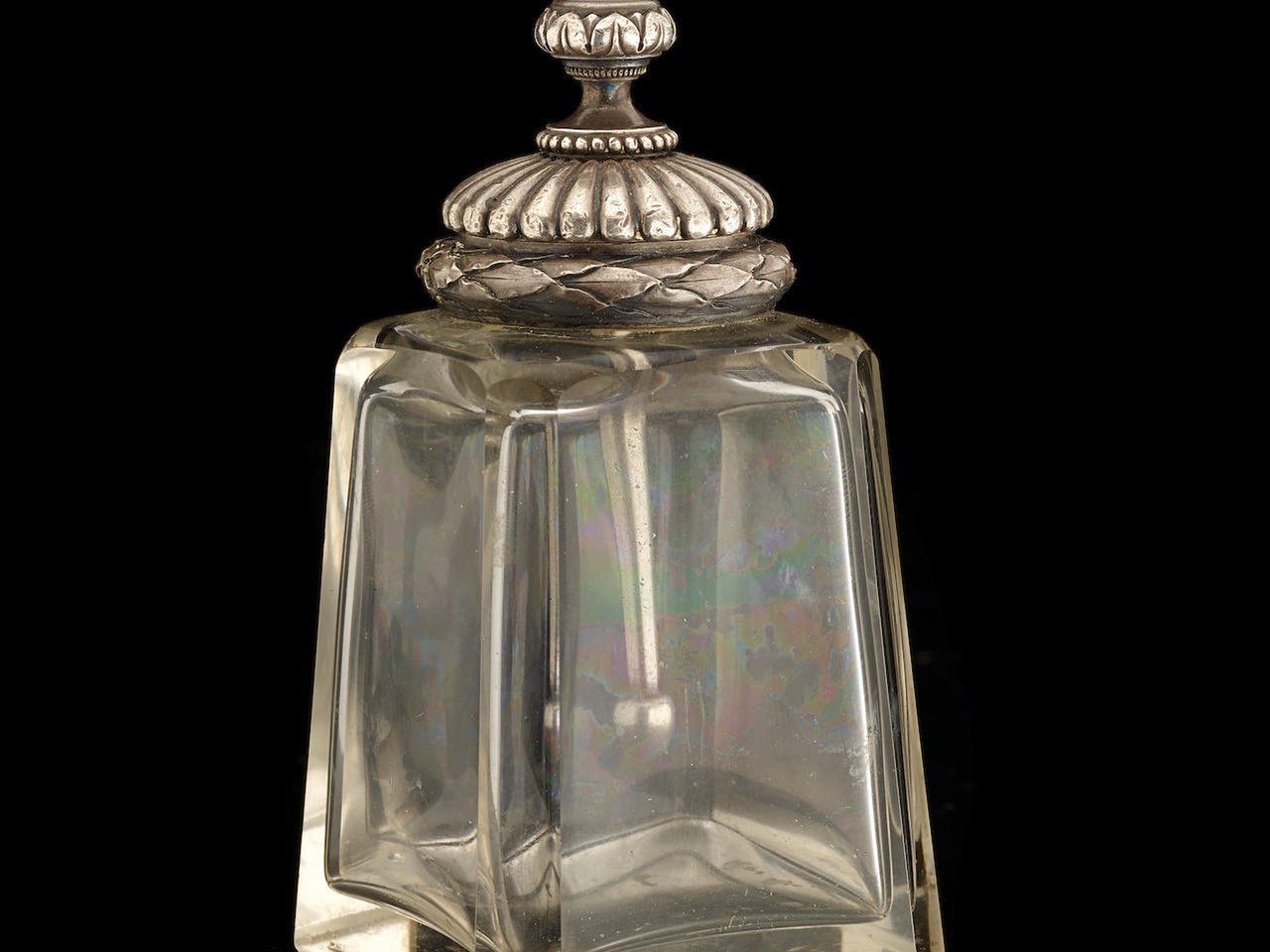 of pyramid shape with faceted corners, the rim mounted with laurel wreath border, the circular lid chased with radiating lobes and crowned with stepped finial mounted with moonstone cabochon, the long scent wand extending into the bottle, 88 standard