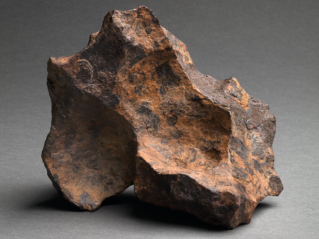 Recovered from the edge of the Kalahari Desert, Gibeon iron meteorites are the bounty of a huge meteorite shower that occurred thousands of years ago that exploded and rained down in an elliptical strewn field in what is now Namibia. Local tribesman recovered this specimen with the aid of a metal detector. Generations earlier, Gibeon meteorites found at the surface by indigenous tribesmen were fashioned into spearpoints and other tools. When cut and etched, the intergrowth of a Gibeon's iron-nickel alloys (it's crystalline structure) is revealed in an exquisite natural design which does not appear in terrestrial ores, and the pattern of Gibeon meteorites is among the most beautiful known. Blanketed with the variegated ochre patina which is the hallmark of the best Gibeon meteorites, this is a superior example of a complete iron meteorite.