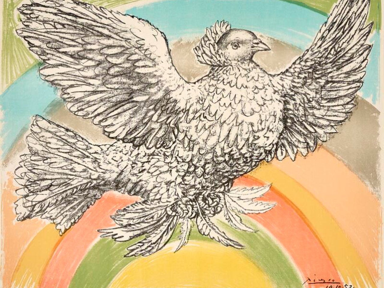 “Colombe Volant”, 1952. Signed Picasso, 11/200. Lithograph in colours.Visible size 51×66 cm.