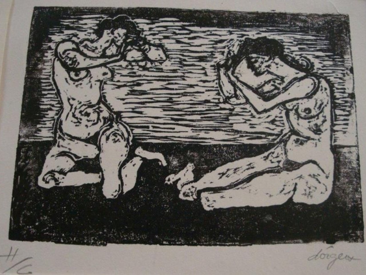 Two nudes, inspired by F. HODLER Woodcut, non-commercial proof. Signed lower right. 10.5 x 15 cm