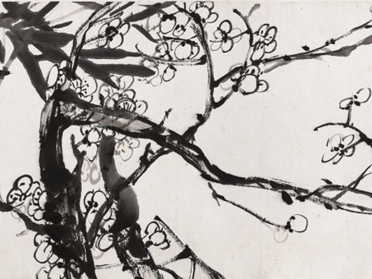 一八九九年十一月,吳昌碩得同邑丁蘭蓀保舉,署江蘇安東縣,因不願曲意逢迎,到任一月即棄去。辭官時有詩云:「可惜梅花發,寒香別意中」,又有題墨竹云:「高節慾師渠」。本幅作梅竹橫斜,兩者皆屬志節堅貞之物,缶翁以墨筆出之,墨瀋淋漓,或旨在表明心跡。