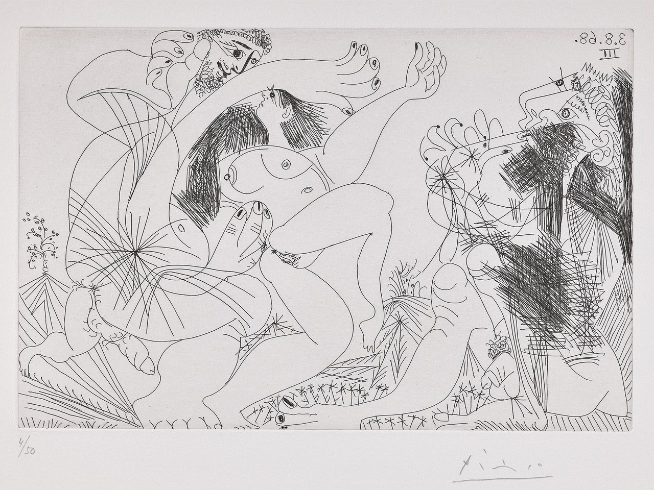 Oasis avec flûtiste et danseurs (Oasis with Flutist and Dancers), plate 238 from 347 Series (Bl. 1718, Ba. 1735) by Pablo Picasso