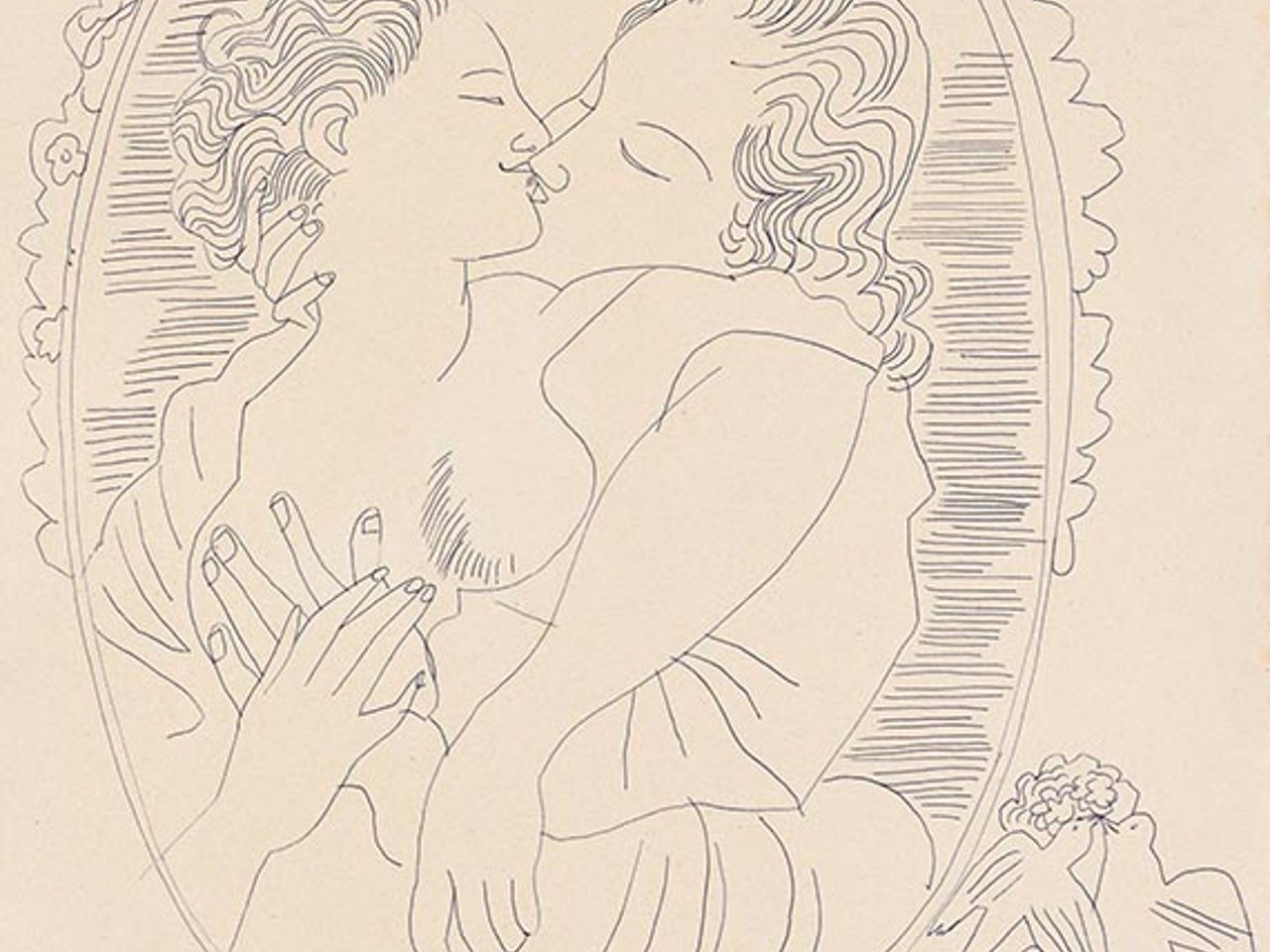 From the artist"s estate. Andy Warhol Foundation for the Visual Arts, New York (until 2014) Private collection, Switzerland (since 2014). Classicism was also a popular art movement in America, reflected not only in the architecture of the Capitol and the White House in Washington, D.C., which continues to significantly shape the public image of the USA to this day but also had its artistic influences in the private sphere well into the 20th century. Warhol"s inspiration for the present drawing could have been either a painted tondo, a gem, a cameo, or even a photograph based on such a model, presumably depicting the ancient subject of "Cupid and Psyche." By adding the two doves, also kissing, at the lower right of the image, Warhol lends the love story between the god Cupid and the mortal princess Psyche a sweetly naive touch reminiscent of Biedermeier-era friendship notes. The present drawing, executed in confident strokes, impressively demonstrates not only the drawing skills of the trained commercial artist but also that Andy Warhol, the most important representative of American Pop Art, already sought a visual engagement with art historical tradition in his early work. In good condition. Upper edge irregular. Minimally browned and with isolated colro tarces and very few discernible foxmarks.