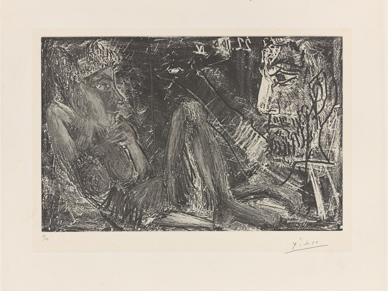 Pablo Picasso (Málaga 1881 - 1973 Mougins). ”Peintre et demi-figure et modèle au chignon”. 1966/68