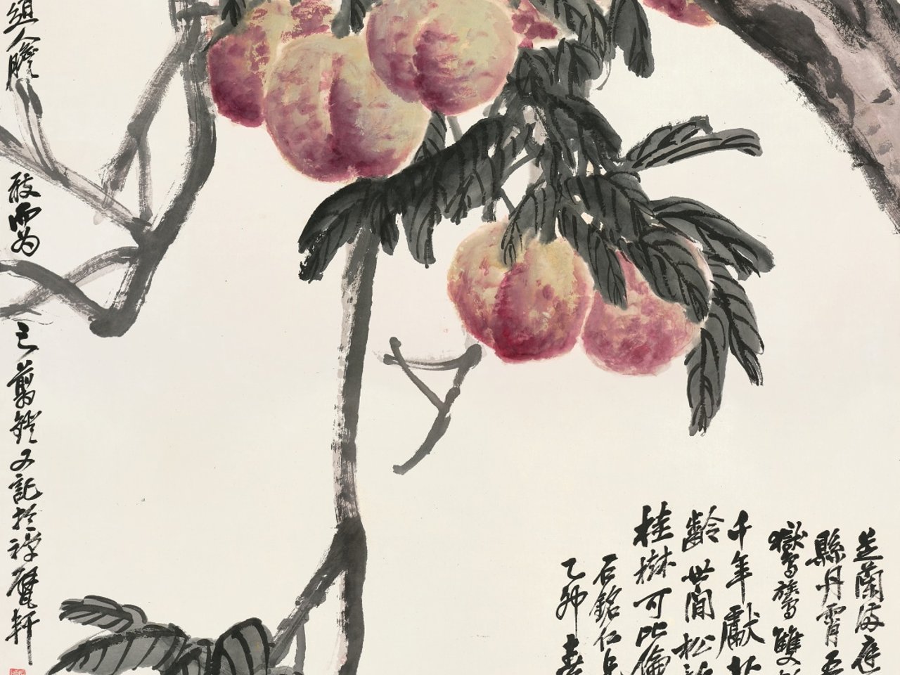 註︰吳昌碩與張石銘頗有淵源,有謂其早年於張家作畫師,張宅「懿德堂」中具其題額「世德作求」。張氏對藝林慷慨捐資,乃西泠印社贊助人。一九一五年,昌碩獲推為上海題襟館書畫會會長,館所隱閑樓乃張氏出資興建,本幅即同年寫贈張氏。畫中碩桃纍纍如串,飽滿豐腴,繁葉墨色淋漓,益襯殷紅之鮮艷,呈長年綿延之美意。畫畢,配行書長題,洋洋灑灑,墨彩互煥,並題謂此乃任渭長、趙悲盦所「不敢畫」者,自許之情,溢於言表!