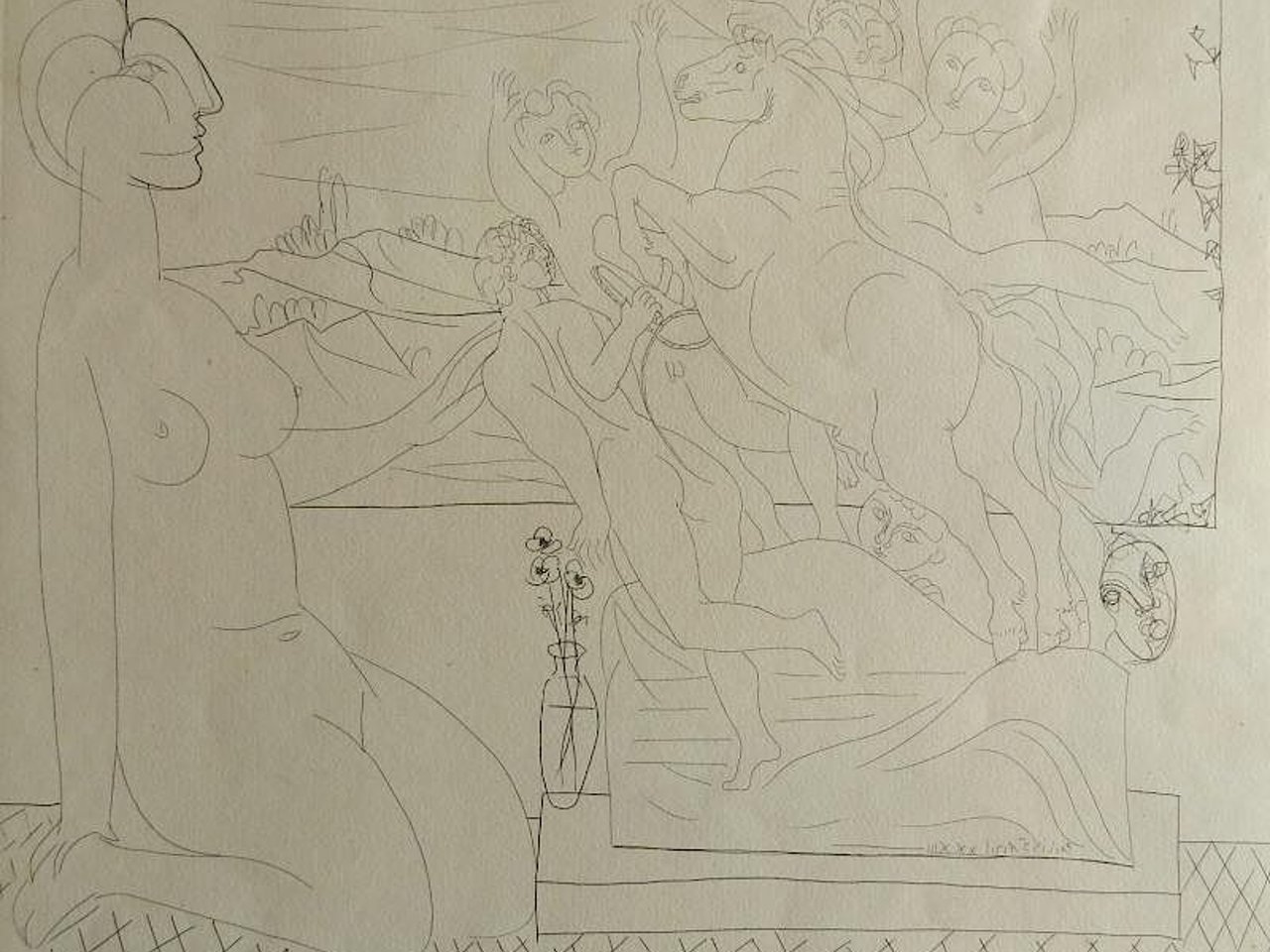 Pablo Picasso (Spanish 1881-1973)- "Modele Contemplant un Groupe Sculpte" (Bloch 175)- etching, 1933, signed in pencil, from "La Suite Vollard", slightly light struck, minor handling creases, 1 light stain top part of image. 11 3/4 x 14 1/4"
