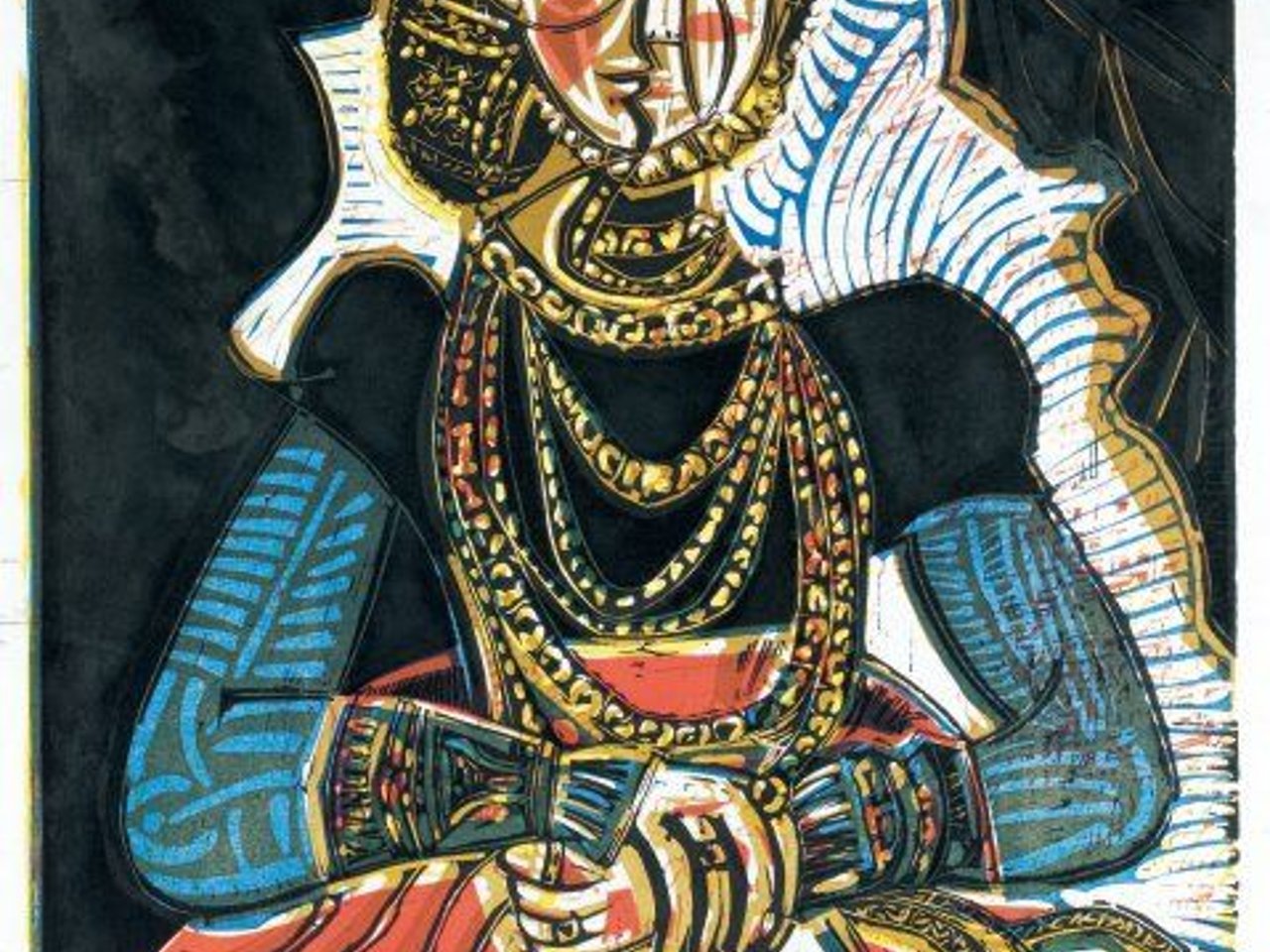 Bust of a woman after Cranach the Younger. 1958 (Bloch 859; Baer 1053 IIICb) 640 x 534 mm. Five-colour gouge engraving on linoleum printed on Arches vellum. Proof signed in blue pencil lower right with the annotation "artiste"s proof", of about fifteen copies outside the edition of 50 for the Louise Leiris gallery. Bears on the back the words "Docteur Joseph Jaffé Sabartès, 3 Avril 1959" Damaged (in the right shoulder and above, in the black part above the left shoulder) doubled. Margins slightly yellowed, small remains of paper stuck on the right edge (about 15 cm from the upper edge) and near the upper left corner. Sheet: 763 x 575 mm. This plate was made by the artist from a postcard representing Cranach the Younger"s painting, Portrait of a Young Girl, 1564 (kept at the Kunsthistorisches Museum, Vienna) that Kahnweiler had sent him.